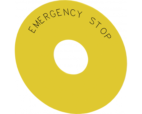 Подложка имеет желтый цвет и самоклеящуюся основу. Наружный диаметр составляет 75 мм, а диаметр отверстия – 23 мм. Подложка снабжена маркировкой «emergency stop». Предназначена для кнопок аварийной остановки.