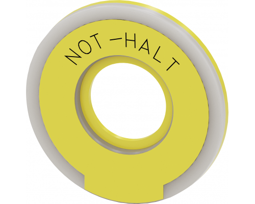 Шайба круглая предназначена для грибовидной кнопки аварийного останова. Имеет желтый цвет и оснащена подсветкой. Толщина шайбы составляет 5 мм. Наружный диаметр – 60 мм, внутренний – 23 мм. На шайбе нанесена надпись 'not-halt'.