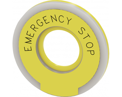 Шайба круглая предназначена для грибовидной кнопки аварийного останова. Имеет желтый цвет и оснащена подсветкой. Толщина шайбы составляет 5 мм. Внешний диаметр – 60 мм, внутренний – 23 мм. На шайбе нанесена надпись «emergency stop».