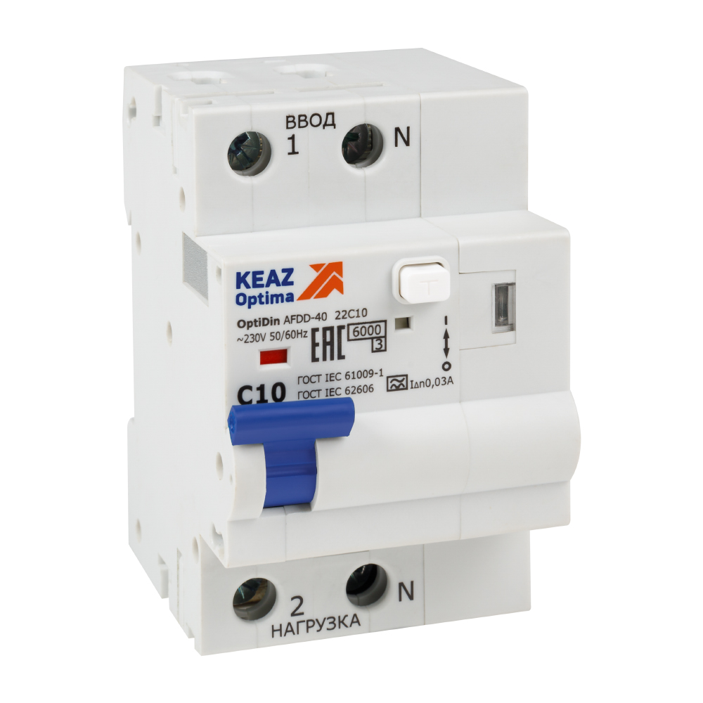 Устройство защиты от дугового пробоя с АВДТ и защитой от повышенного напряжения на номинальный ток 10 A и номинальный отключающий дифференциальный ток 30 мА.