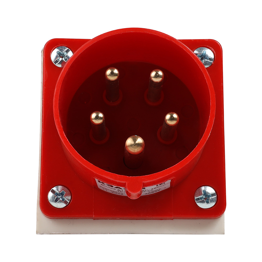 Силовая вилка 5 полюсная на номинальный ток 16 А и рабочее напряжение переменного тока 380 В.