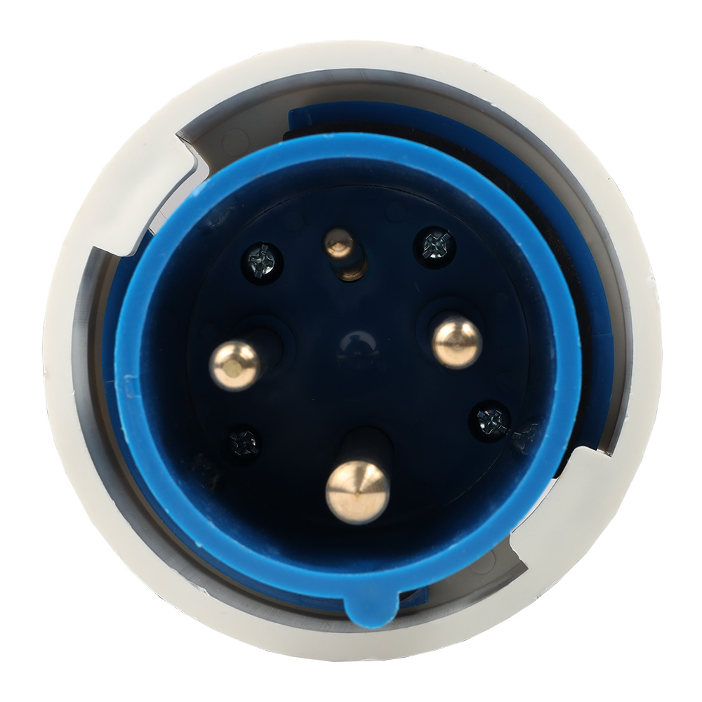 Силовая вилка 3 полюсная на номинальный ток 63 А и рабочее напряжение переменного тока 220 В.