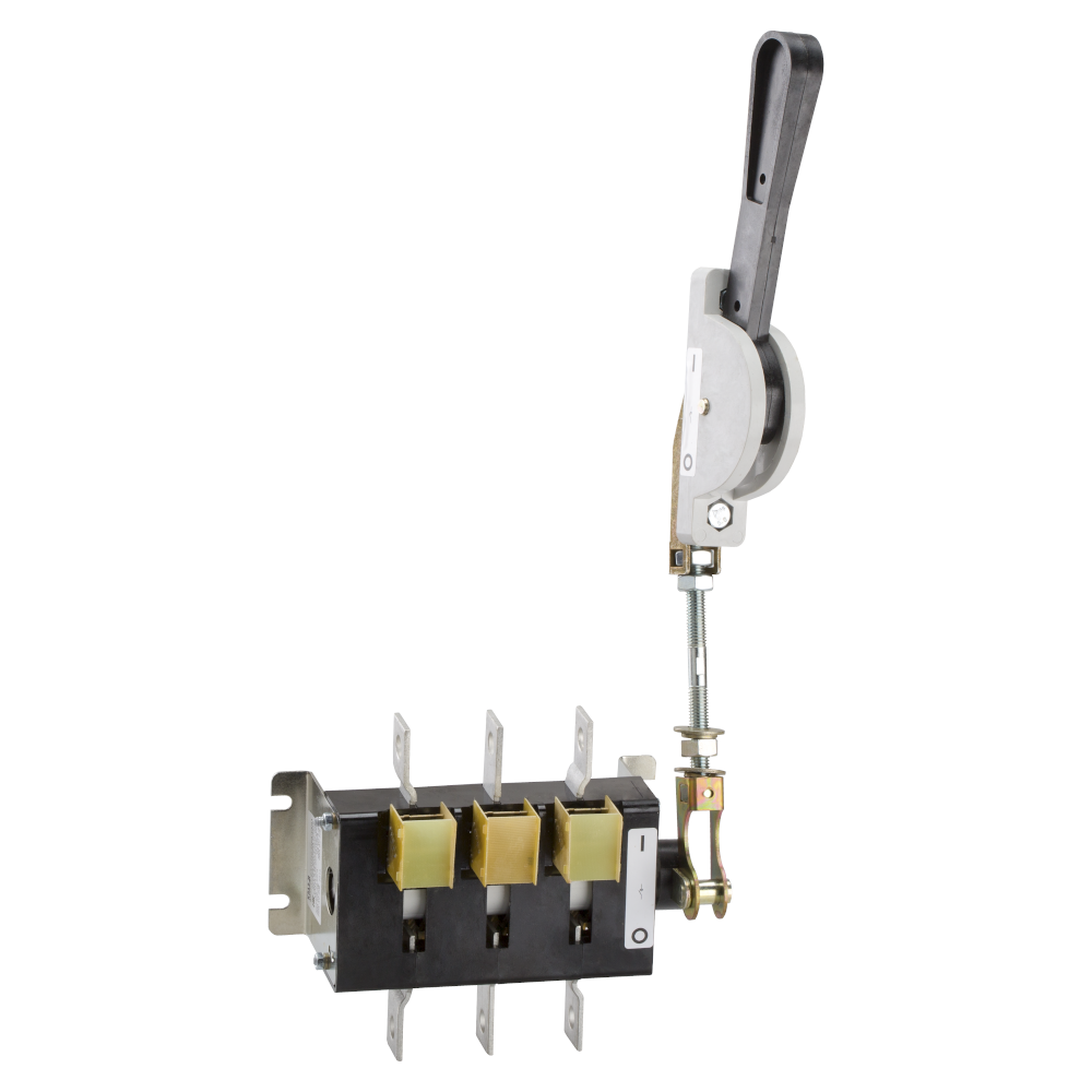 Фото. Выключатель-разъединитель 3 полюсный на номинальный ток 100 А, в котором установлена несъемная рукоятка.