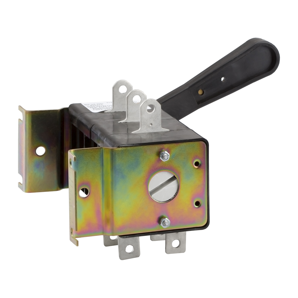 Фото. Выключатель-разъединитель 3 полюсный на номинальный ток 100 А, в котором установлена несъемная рукоятка.