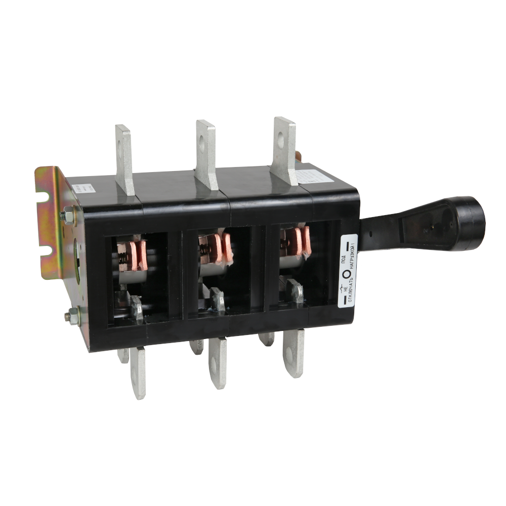 Выключатель-разъединитель 3 полюсный на номинальный ток 630 А, в котором установлена несъемная рукоятка.
