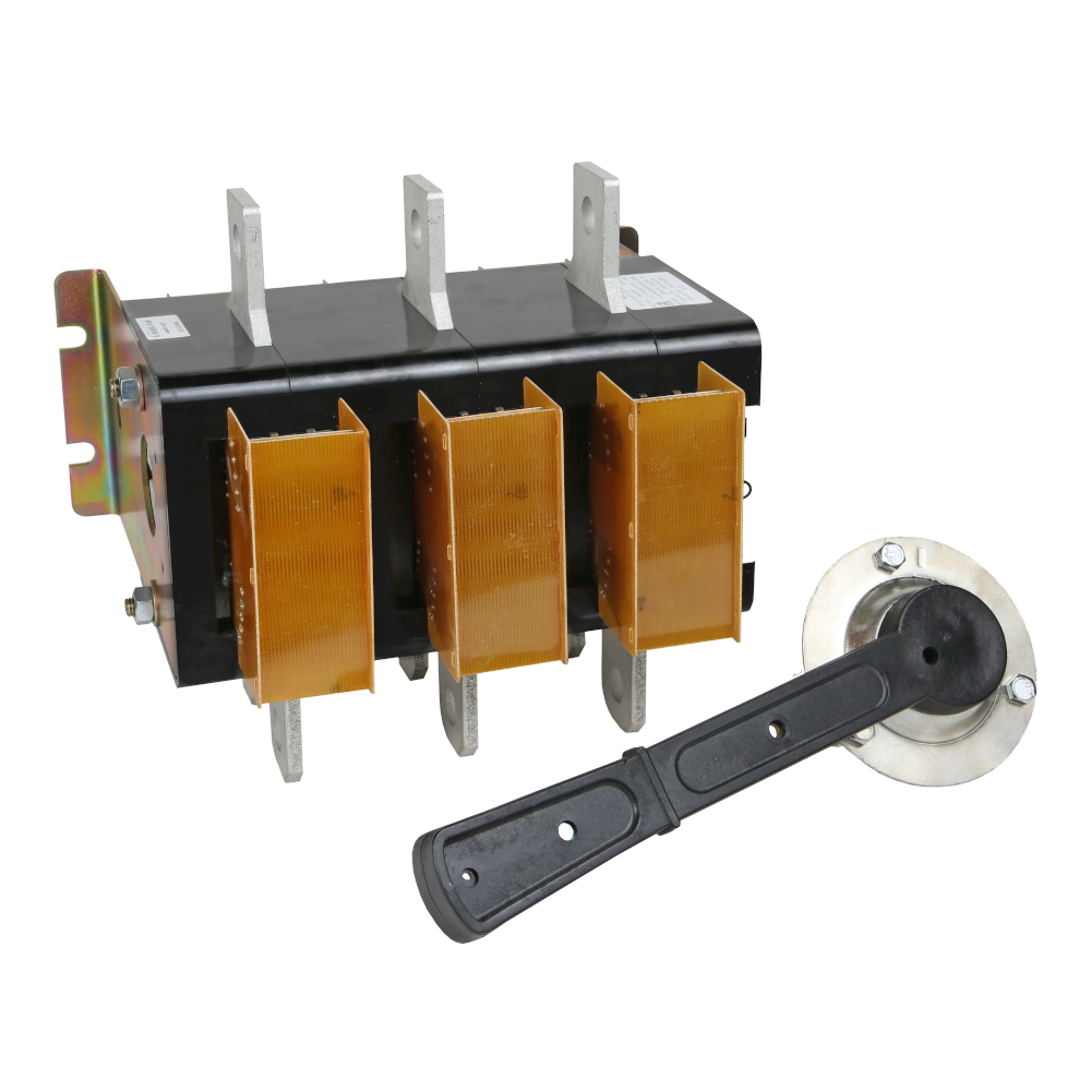 Фото. Выключатель-разъединитель 3 полюсный на номинальный ток 630 А, в котором установлена съемная рукоятка.