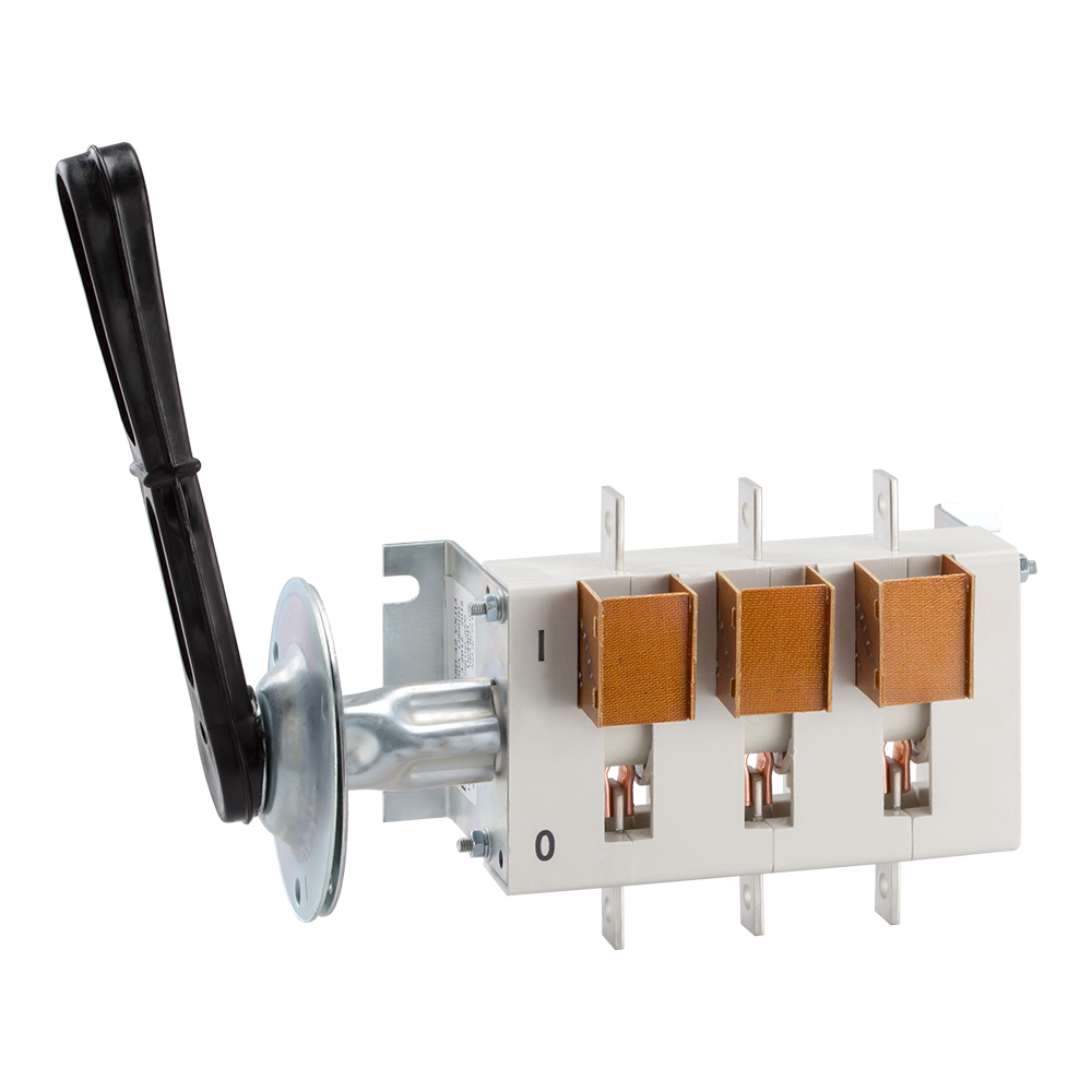 Фото. Выключатель-разъединитель 3 полюсный на номинальный ток 100 А, в котором установлена несъемная рукоятка.