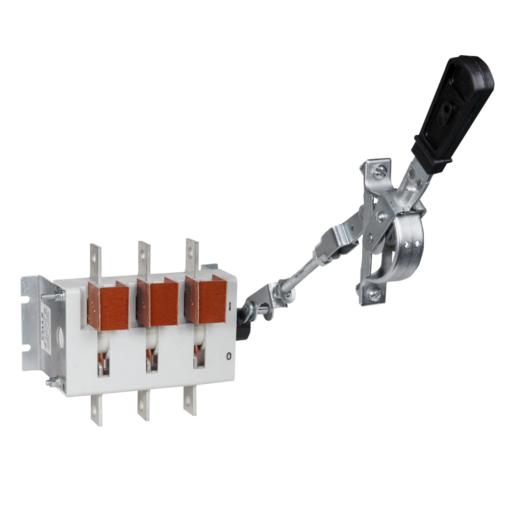 Фото. Выключатель-разъединитель 3 полюсный на номинальный ток 400 А, в котором установлена несъемная рукоятка.