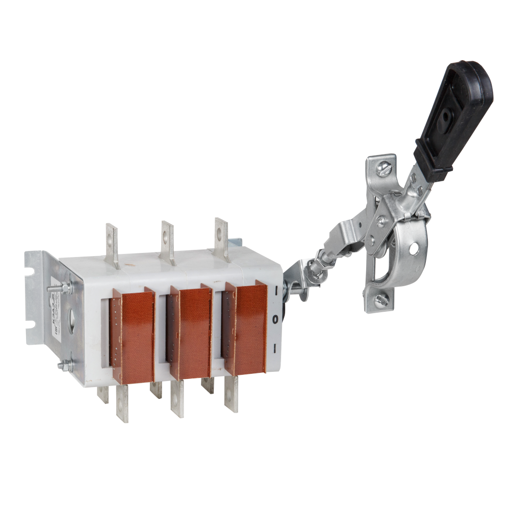 Фото. Выключатель-разъединитель 3 полюсный на номинальный ток 400 А, в котором установлена несъемная рукоятка.