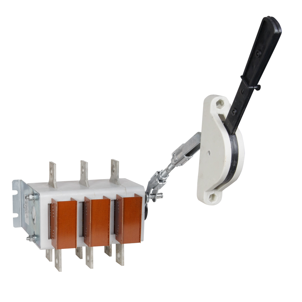 Фото. Выключатель-разъединитель 3 полюсный на номинальный ток 630 А, в котором установлена несъемная рукоятка.