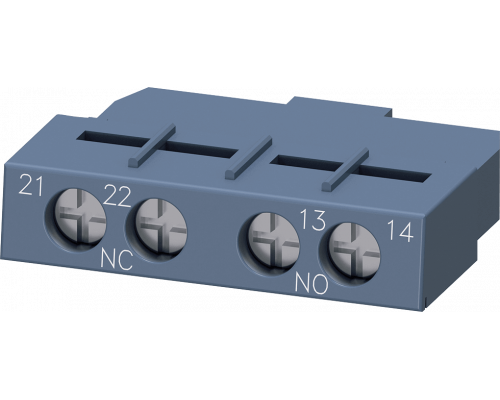 Предназначен для использования с автоматическими выключателями 3RV2 типоразмеров S00 и S0. Имеет конфигурацию 1НО+1НЗ. Подключение осуществляется посредством винтовых клемм. Блок контактный фронтальный.